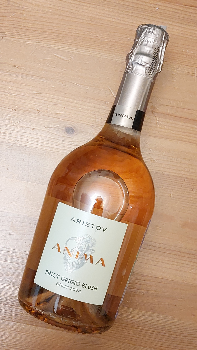 Это игристое Аристов уже третье из серии Anima на канале. До этого я попробовал Mellisimato rose brut и просто Mellisimato brut. Лето - время посиделок на природе, приятных семейных и корпоративных мероприятий, и пока линейка игристых вин Anima прекрасно себя показало для таких мероприятий. Потому будет позитивным расширить кругозор и рассмотреть поближе ещё одно вино из пузырчатой серии, Aristov Anima Pino Grigio Blush brut 2024. Тут все как и в предыдущих обзорах. Пузатая бутылка, добротная капсула, пробка noname из агломерата, стандартное мюзле и фирменная плакетка для игристых Aristov от Кубань-Вино. Прозрачное стекло, как и в случае с розовым брютом, выглядит выигрышно, т.к. цвет вина невероятно наряден. Этикетка также в стилистике серии Anima. Немного простая, со странной роботоподобной "женской душой" вина, как ее видят на Кубани, но в целом уже узнаваемо и понятно. Контрэтикетка тоже уже привычная, в ней все самое главное и интересное, а если интересного мало: добро пожаловат