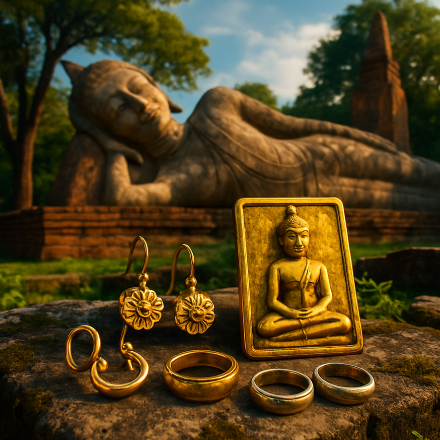 Раскопки продолжились, и вскоре обнаружили еще три артефакта. Один из них — лист из чеканного золота размером около 8 на 12 сантиметров. Он изображает Будду на лотосовом постаменте с жестом Витарка-мудра — символом наставления и мудрости. Иконографические детали, такие как нимб, удлинённые мочки ушей и складки одежды, соответствуют стилю Дваравати. Небольшое отверстие в верхней части говорит о возможном ношении или размещении на видном месте.