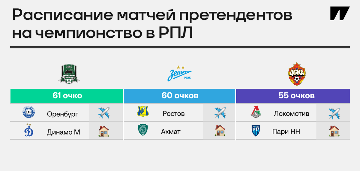 Следующий тур стартует как раз с матча «Оренбург» – «Краснодар» в субботу, 17 мая. При победе «Краснодар» еще не отпразднует чемпионство – но это будет возможно на следующий день при поражении «Зенита» в Ростове.