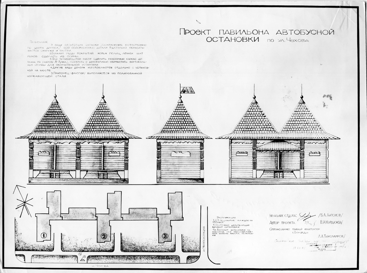 Проект павильона автобусной остановки по ул. Чехова. Согласован к реализации 28 июня 1985 года.
