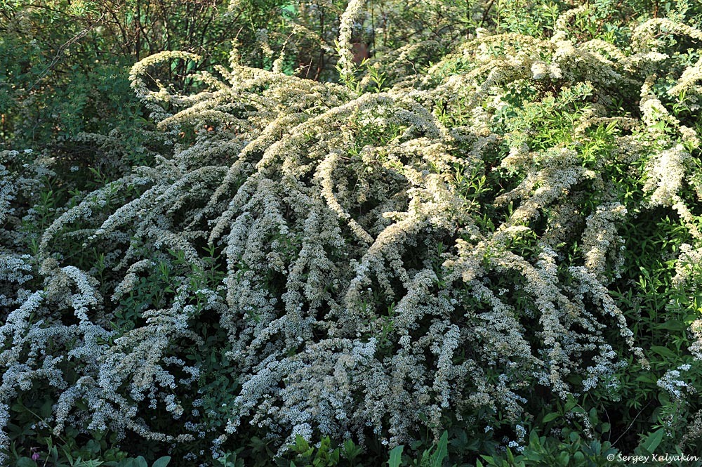 На фото смешанная изгородь из спиреи серой 'Grefsheim' и спиреи Вангутта. За счет смешанной посадки удается вдвое растянуть срок цветения: когда цветет спирея серая, Вангутта всё ещё стоит в бутонах. Однако по высоте такая изгородь неоднородна: видно, что спирея Вангутта целиком в кадр не вошла.