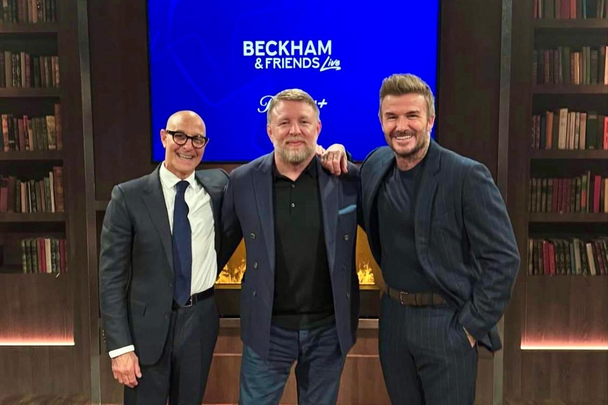 Фотографией тройки поделился сам Бекхэм. Бывший футболист, режиссёр и актёр позировали на фоне экрана с логотипом “Beckham & Friends Live”,