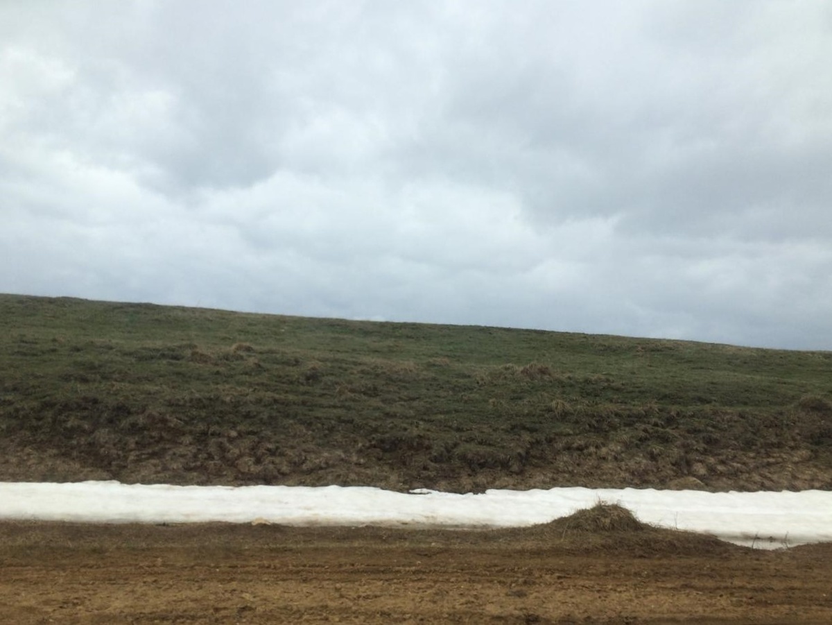 Обратно домой из Кисловодска я решил поехать не по ставропольской трассе, по которой я добирался туда, а по горной дороге через Карачаево-Черкессию, которая идет через перевал Гум-Баши. Это - самая высокогорная автодорога России. Наивысшая точка перевала - около 2200 метров над уровнем моря. Весной я там ни разу не был. Хоть и было пасмурно, но травка на горных склонах, зеленые листики и цветки на деревьях по дороге на перевал создавали теплое весеннее настроение. Но по мере подъема выше пейзаж начал меняться. Зелень куда-то исчезла, а на серых склонах стали появляться белые пятна. Снег! От близкого лицезрения снега я уже отвык, и захотелось посмотреть его вблизи, и даже коснуться. Свернув с основной дороги, повернул к горнолыжной станции и вполне осуществил задуманное. Вот он - первомайский снег! А еще дальше - заснеженные вершины Кавказского хребта. Отсюда в ясную погоду можно наблюдать Эльбрус, но погода была не ясная. Информационные щиты на перевале извещали, что первыми покор