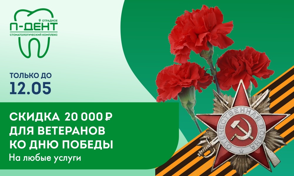 С Днём Победы! Скидка 20 000 рублей для ветеранов ко Дню Победы С 25 апреля по 12 мая в стоматологическом комплексе П-ДЕНТ Отрадное проходит специальная акция ко Дню Победы. Ветераны Великой Отечественной войны и труженики тыла могут получить скидку 20 000 рублей на любое лечение. Для получения скидки необходимо предоставить соответствующие документы. С искренним уважением, Стоматологический комплекс П-ДЕНТ Телефон +74994446998