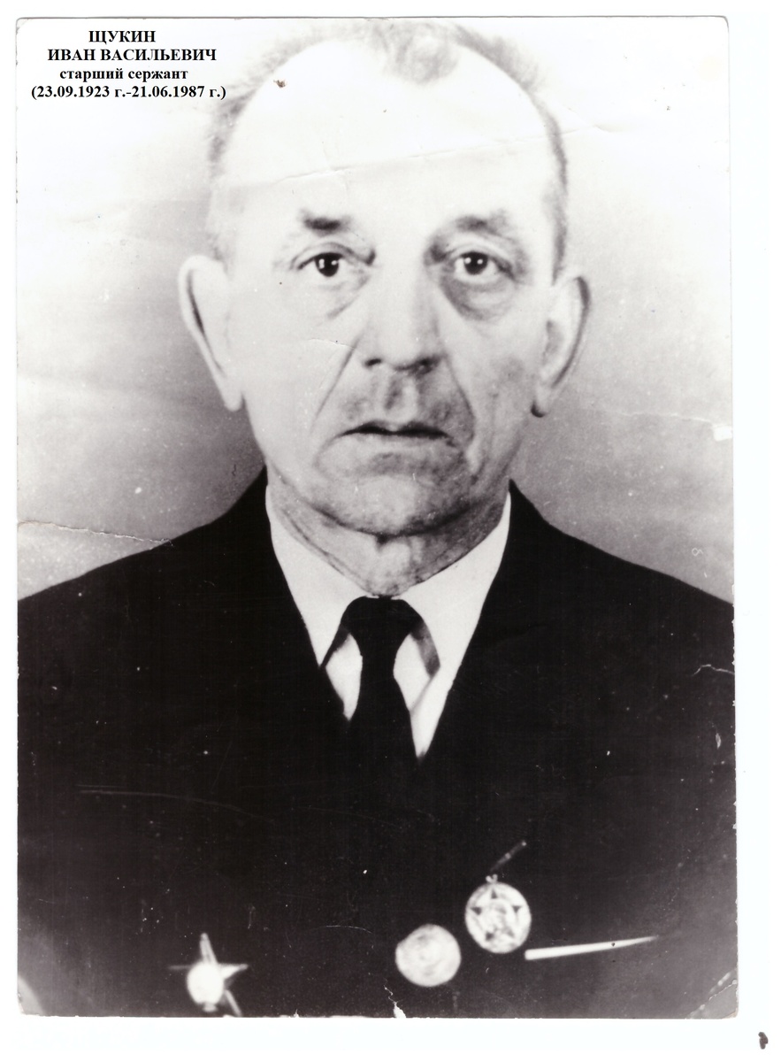 Мой дед Щукин Иван Васильевич (23.09.1923 г.-21.06.1987 г) ГОРЖУСЬ ТОБОЙ! Родился и вырос в г. Кыштыме Челябинской области. 22.09.1941 г. (18 лет) был призван Златоустовским РВК Челябинской области. В годы войны был разведчиком, командиром орудия 85 мм пушки, 122 мм и 152 мм гаубиц 7 батареи 3 дивизиона 276 артиллерийского Катовицкого полка 135 Стрелковой Краковской Дивизии, позднее -старшиной стрелковой роты 178 стрелкового полка. 26.03.1945 г. в районе д. Нойвальде (Австрия), осуществляя разведку, обнаружил 2 станковых пулемета и 1 артбатарею противника, огонь которых был подавлен огнем дивизиона, что предотвратило массовое кровопролитие при продвижении нашей пехоты. За данный подвиг был награжден Орденом Красной Звезды. Также имел награды: Орден Отечественной войны II степени, Медаль "За победу над Германией в Великой Отечественной войне 1941-1945 гг." В звании старшего сержанта уволен в запас 26.12.1946 г. После окончания войны вернулся в родной г. Кыштым Челябинской области. Умер