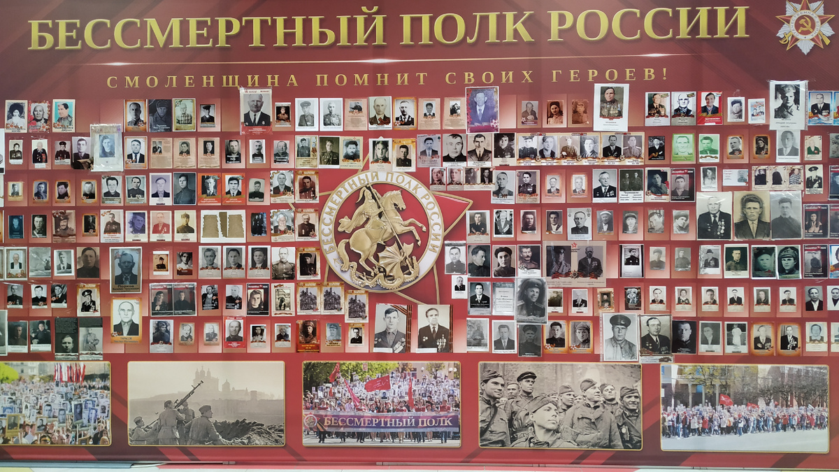 Каждый год в одном из торговых центров нашего города оформляется специальный стенд "Бессмертный полк", куда жители приносят и размещают фотографии своих родных, воевавших в Великой Отечественной войне.