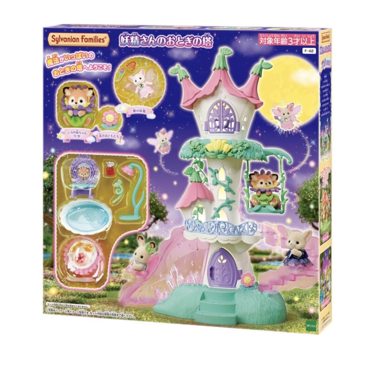 Кроме новой семьи хомяков Epoch наконец-то показали и пару новинок из серии Misty Forest, которые мы уже видели, но без деталей. Наборы выйдут 5 июня в Японии. Набор со сказочным замком вызывает противоречивые чувства. Выбор цветов очень своеобразный. Правда, постепенно замок начинает восприниматься иначе. Когда я впервые увидела его на фотографии, то он не понравился мне совершенно. Сейчас смотрю и вроде даже и ничего такой. 🙄 Именно в этом наборе пастельные оттенки кажутся уместными. В набор входит сидящий олененок и феечка в виде фенека. Фигурки очень милые, но я продолжаю осуждать пластиковые наряды фей. Наполнение замка я бы назвала средненьким. Зеркало совсем уж примитивное и выглядит очень дешево. Все-таки хотелось бы более изящной мебели и аксессуаров и чего-то более лесного. Столик-перевертыш вроде неплохой, но, надеюсь, посуда всё-таки съемная? Если нет, то тогда столику тоже минус. Лучше бы был обычный столик и отдельно посуда и тортики. Ванна довольно интересная,
