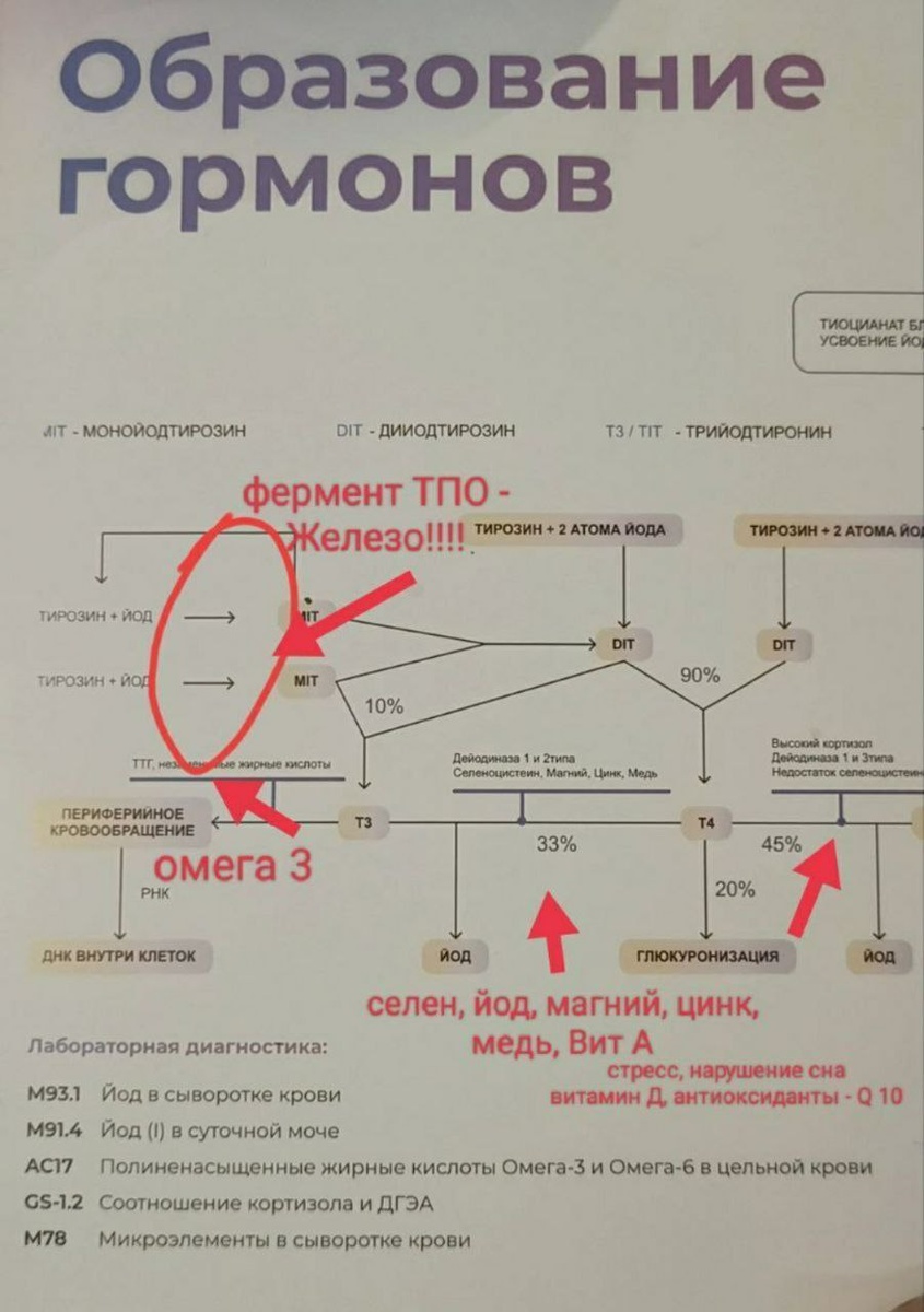 Вот важные составляющие для здоровья щитовидной железы 👆 Обратите внимание, как стресс, в том числе недосып, избыток и недостаток физической нагрузки, диеты и голод влияют на нарушение превращения гормонов📕