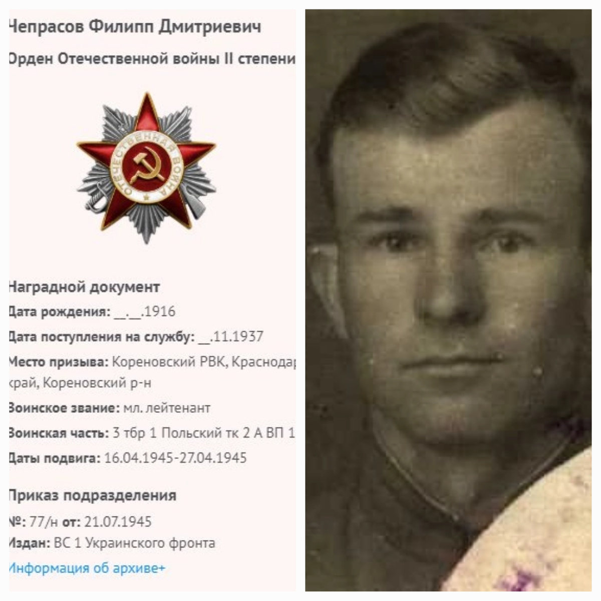 😌Друзья, 9 мая, Важный День для каждого в мире! 🎈Так давайте не будем забывать об этом ни на секунду, и тем более тех благодаря кому живы все мы. 🎥Сегодня хочу вас познакомить с Героем Войны - Чепрасовым Филиппом Дмитриевичем Дата рождения ..1916; 10.12.1916 Место рождения Воронежская обл., Землянский р-н, с. Голосновка Дата поступления на службу 01.10.1937 Место призыва Кореновский РВК, Краснодарский край, Кореновский р-н Воинское звание мл. лейтенант; лейтенант Воинская часть 3 тбр 1 Польский тк 2 А ВП 1 УкрФ (3 тбр, 1 Польский тк, 2 А ВП, 1 УкрФ); 3 тбр 1 тк (3 тбр, 1 тк); 397 сп 106 сд (397 сп, 106 сд) Наименование награды Орден Отечественной войны II степени Медаль «За победу над Германией в Великой Отечественной войне 1941–1945 гг.» ======================= 🎯 ☎ телефон для связи: +7-910-645-69-10