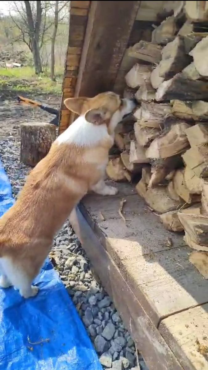 — Сказали помочь — помогаю! Только объясните, как это вообще работает?.. Лана стояла, уткнувшись носом в поленницу, и делала вид, что вот-вот вытащит оттуда самое главное, стратегическое полено, которое, вероятно, удерживает всю конструкцию. Мы, конечно, попросили её по-хорошему: "Помоги, Ланочка, дрова складываем!" Но с кем мы говорим? С девочкой, которая умеет за три секунды вычислить кабачок, спрятанный в любой сумке. Она тут же всё поняла по-своему. Сначала был тщательный анализ: нос ткнулся в каждое полено. Видимо, она сравнивала запах с родным лесом, где царствуют дубы и нет ни одной ели. Проверив — дуб. Одобрительно кивнула. Проверено коргином — значит, можно класть в печку. А потом — игра! Ах, этот голубой тент! Поскользкий, шуршащий, тянущий лапы в танец! Лана устроила на нём настоящий фестиваль ушей и хвоста (которого, как мы помним, нет, но это ей не мешает считать, что он есть). Она бегала, скользила, пританцовывала, будто то были не дрова, а приглашение на бал. Пару раз он