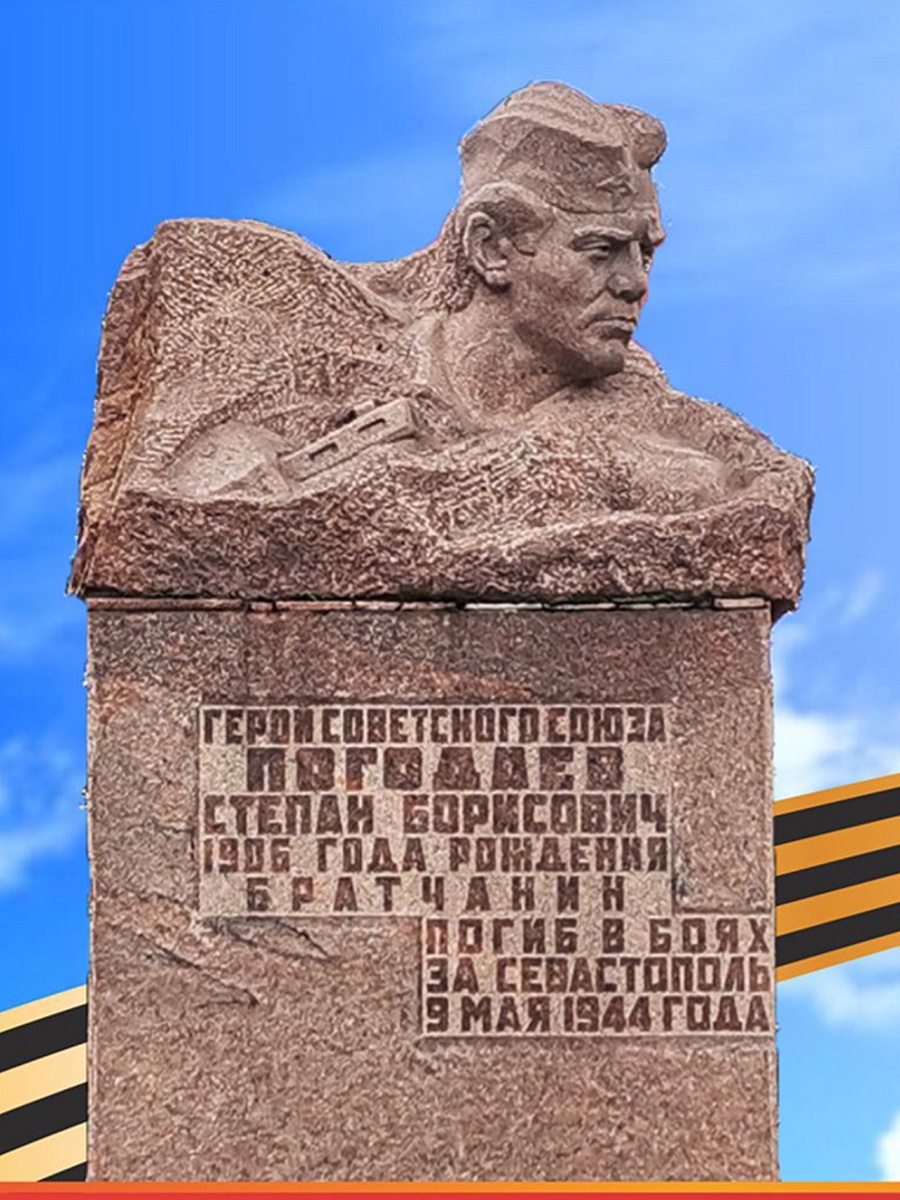 9 мая для Братска - это не только День Победы. В 1944 при штурме Севастополя братчанин Степан Борисович Погодаев закрыл вражескую амбразуру своим телом. При штурме высоты 178.2 противник пулемётным огнём преградил путь нашей пехоте. Подразделение понесло потери и вынуждено было залечь. Погодаев решает обезвредить вражескую огневую точку. Скрытно подполз к развороченной колючей проволоке, но противник замечает храбреца и дают по нему очередь, которая разрывает руку бойца. Но он не останавливается, истекая кровью Степан Борисович бросает связку гранат в дзот противника, но пулемёт продолжал стрельбу. Тогда старший сержант Погодаев бросился к дзоту и закрыл его амбразуру своим телом. Увидев его подвиг, солдаты без команды бросились на врага. Ценою своей жизни Степан Борисович содействовал выполнению боевой задачи подразделением. Вот что рассказывал нашим землякам однополчанин Степана Погодаева, Федор Иванович Матвеев: «9 мая 1944 года 263 дивизия вместе с другими частями наших войск на