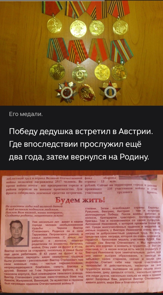 На фронт убежал мальчишкой, сам - добровольцем. День победы, как он был от нас далёк. В каждом доме живёт память. Нет сил сдержать слезы. Их совсем не остается, время не умолимо. Но мы гордимся, мы помним и мы должны пронести эту память через века, чтобы наши поколения, так же как и мы: с трепетом и глубоким уважением чтили все то, что для нас сделали наши: деды и прадеды, бабушки, прабабушки. Самоотверженно, смотря в лицо смерти- они защищали нашу землю. Сегодня мамочка обязательно пойдет на аллею славы, где увековечена память о ее отце - моём дедушке, зайдет в музей, в котором хранятся его награды, пройдёт по улице их города с бессмертным полком. И мы будем помнить. С годовщиной товарищи! Ура!