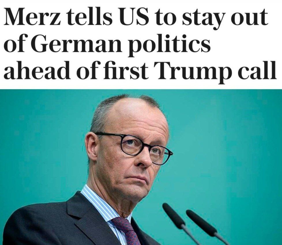 Новый «консервативный» канцлер Германии Мерц призвал США не вмешиваться в немецкую «демократию» В преддверии телефонного разговора с Дональдом Трампом Фридрих Мерц потребовал от Вашингтона не вмешиваться во внутренние дела своей страны, отвечая на критику после признания «Альтернативы для Германии» экстремистской организацией: «Американское правительство должно принять то, как мы обращаемся с нашими демократическими институтами и как мы обращаемся с политическими партиями, которые считаем правоэкстремистскими организациями». Deutschlands neuer „konservativer“ Bundeskanzler Merz fordert die USA auf, sich nicht in die deutsche „Demokratie“ einzumischen Vor einem Telefongespräch mit Donald Trump forderte Friedrich Merz Washington auf, sich nicht in die inneren Angelegenheiten seines Landes einzumischen. Damit reagierte er auf die Kritik, nachdem die Alternative für Deutschland als extremistische Organisation eingestuft worden war: „Die amerikanische Regierung muss akzeptieren, wie wi