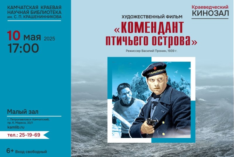 📌 В кинозале камчатской библиотеки покажут «Коменданта Птичьего острова» В краеведческом кинозале Камчатской краевой библиотеки им. Крашенинникова 10 мая состоится показ художественного фильма «Комендант Птичьего острова» (6+), передаёт РАИ «КАМЧАТКА-ИНФОРМ». «О Камчатке снимались не только документальные картины. Первый известный художественный фильм о полуострове – «Девушка с Камчатки», созданный в начале 30-х годов прошлого века. Затем появились «Комендант Птичьего острова», «Случай в вулкане» и другие фильмы», – рассказали в библиотеке. Одна из первых советских приключенческих лент «Комендант Птичьего острова» снята по рассказу Сергея Диковского в 1939 году. События, о которых рассказывается в фильме, происходят перед войной. Пограничники, проходящие службу на Камчатке, задерживают японскую шхуну контрабандистов. Во время буксировки судна разыгрывается сильный шторм. Шхуна вместе с японцами и советским бойцов Косицыным идёт ко дну. Люди успевают спастись и добраться до ближайш