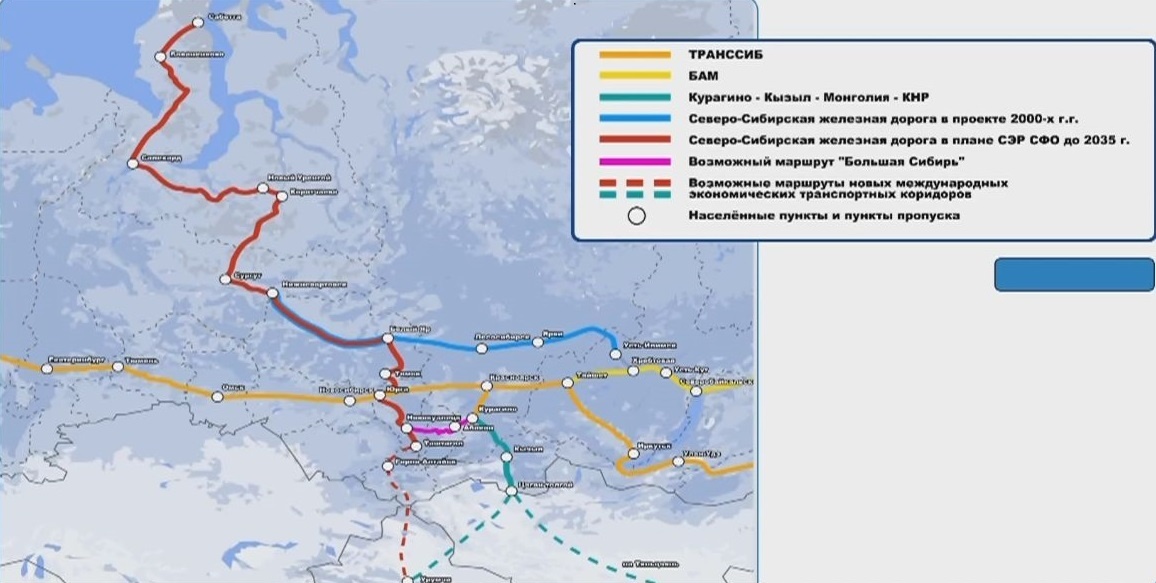 Тем не менее она полностью поддерживает проекты Северо-Сибирской магистрали и линии Курагино – Кызыл (с продлением до Китая), указывая на то, что их отсутствие сдерживает дальнейшие шаги в социально-экономическом развитии Сибири. Важность других инициатив также была упомянута, среди которых сейчас реализуется проект по восстановлению ветки Сковородино – Джалинда с перспективой продления до китайского города Мохэ.