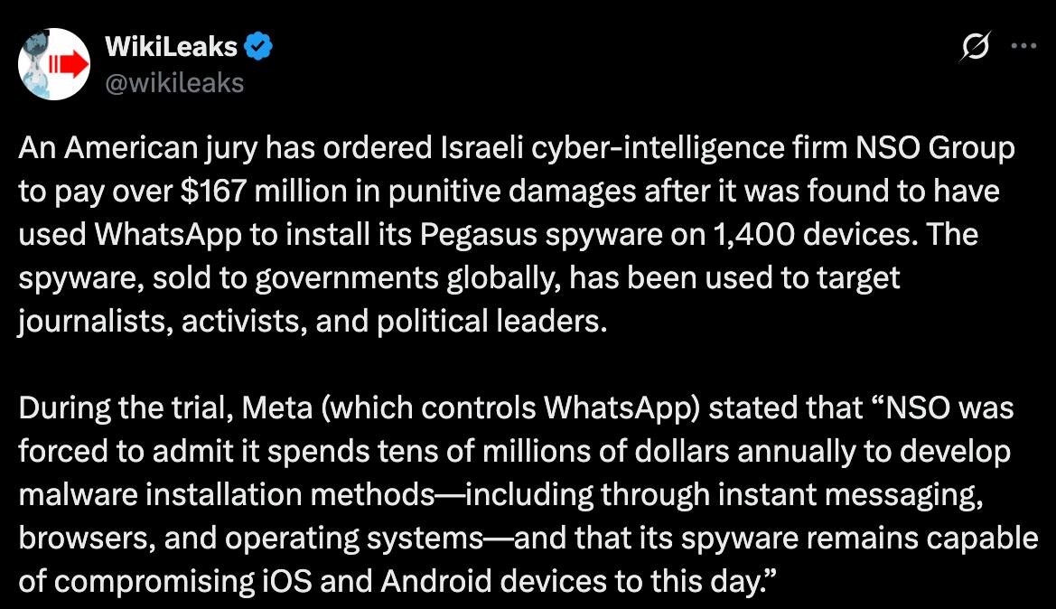 Pegasus pandemonium: US jury orders Israel’s shady NSO Group to pay $167M for using WhatsApp to deploy spyware on 1,400 devices #NSO