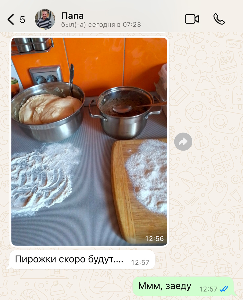 Мой отец из тех, кто не может принять помощь просто так, даже от дочери. Приболел. Скрывал долго, стесняясь нагружать меня своими болячками, знал, что мы оба с мужем тоже не совсем здоровы. Но все тайное рано или поздно становится явным. Забежала попроведать, а тут опухшая нога с трофической язвой и ещё пара проблем по здоровью. Отругала за то, что молчал, занялась им вплотную: больница, анализы, лечение- всё оплатила. Ну, и папа, такой: Благодарит как может: пирожки нам стряпает (тесто заводит сам), окрошку делает, пельмени ладит, сегодня карасиков нажарил. Вот такой он у нас, 76 лет, мне 50. люблю его от Земли до неба и обратно!