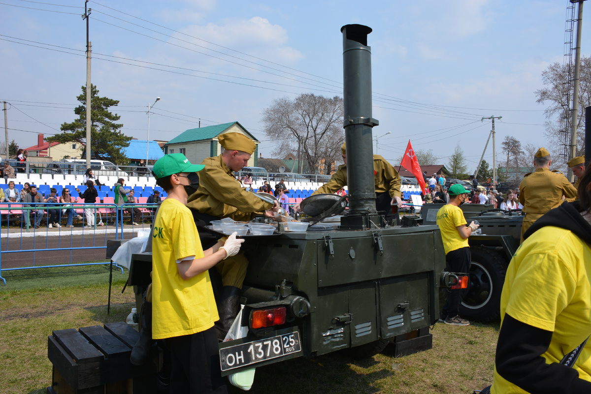 9 Мая более 3,5 тысяч белогорцев и гостей города угостили солдатской кашей. 6 полевых кухонь военнослужащие 35-й Армии развернули в городском парке культуры и отдыха. - Готовили кашу традиционно военные, на базе воинских частей, - рассказала начальник отдела по труду и потребительскому рынку Мария Оганесова. – Раздали более 3,5 тысяч порций. Город для приготовления солдатской каши заготовил 180 килограммов гречки, 360 банок тушенки, 6 кг соли, 6 кг чая и 30 кг сахара. А также 150 булок хлеба и по 36 кг масла, лука и моркови. Угощались белогорцы кашей на трибунах и в установленной палатке на поле. Там были организованы зоны для приема пищи. В раздаче каши были задействованы 30 волонтеров. В их числе работники муниципальных учреждений и студенты Амурского многофункционального центра профессиональных квалификаций. Угощение продолжалось 1,5 часа, пока не закончилась каша. - Солдатская каша – это не просто еда, это символ памяти бессмертного подвига наших прадедов, дедов, солдат, - подчеркн