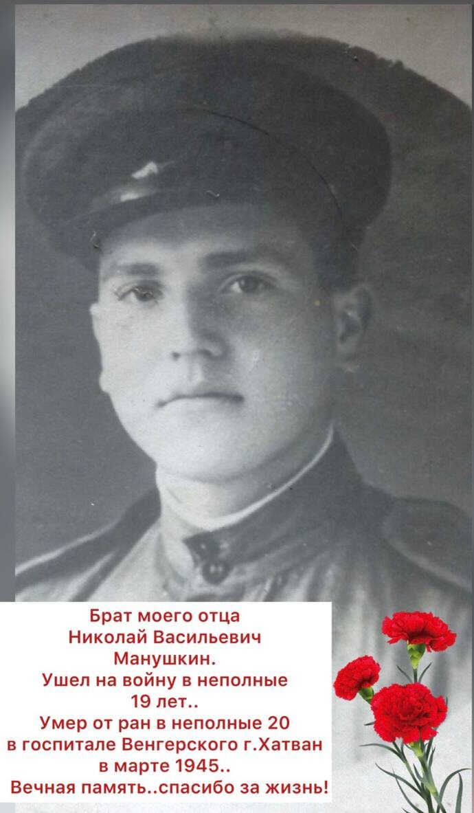 Нет в России семьи такой, Где б не памятен был свой герой, И глаза молодых солдат, С фотографий увядших глядят. Этот взгляд, словно высший суд, Для ребят, что сейчас растут. И мальчишкам нельзя: Ни солгать, ни обмануть, Ни с пути свернуть!!! Брат моего отца, Манушкин Николай Васильевич, ушел на войну в неполные 19 лет, умер от ран в марте 1945 года..в неполные 20 лет.. Мой отец, Манушкин Валентин Васильевич, труженик тыла. Учитель истории с 59-леьним стажем. Долгое время-директор 1 Пересыпкинской школы. Воспитал не одно поколение благодарных учеников. Ушел из жизни в пролом году в возрасте 95 лет.. Трудно подбирать слова! «Люди! Пока сердца стучатся, помните! Какою ценой завоевано счастье! Пожалуйста! Помните!..» Помним! Гордимся! Благодарим!.. Вечная память..
