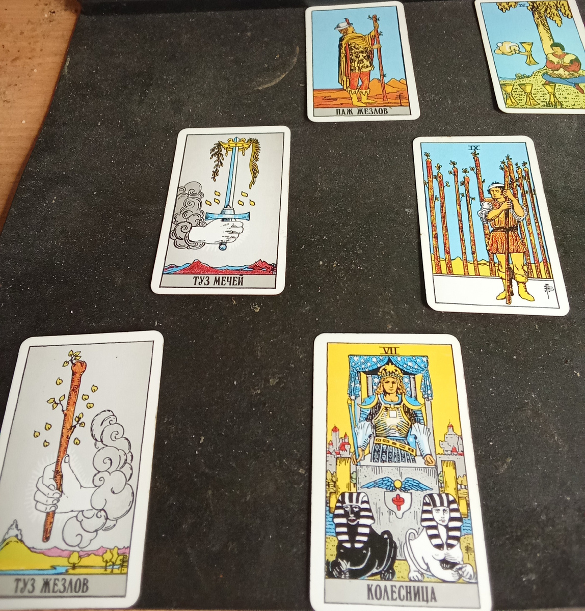Посмотрим как у вас идут дела в настоящие время? 1. Правильно ли вы выбрали способ решения проблем? - Паж Жезлов - я вижу что вы выбрали совершенно правильный метод для решения своих проблем,и теперь остаётся только ждать и наблюдать за ходом событий. 2. Текущая ситуация в настоящие время - Туз Мечей - Видно что ситуация приближается к своей логичной кульминации , для её развязки нужно сделать последний шаг,он решит всё. 3. Нужно ли будет вносить изменения в ситуацию? - Туз Жезлов - Очевидно что вам так же нужно будет корректировать что то на быструю руку, так как ситуация будет держать вас в постоянном напряжении до момента своего завершения. 4,5 - Развитие ситуации в будущем - 4 Кубков,9 Жезлов - Возможно все будет происходить не так как вам бы хотелось, и может быть что случиться что - то неожиданное и непредвиденное потому будьте готовы ко всему чтобы не произошло.Если будет возможность что то изменить воспользуйтесь данной возможностью. 6. Конечный результат - Колесница - Ситуаци