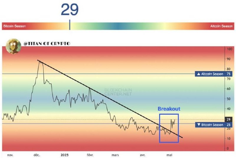 Альтсезон? Первый сигнал есть. После месяцев падения, Altcoin Season Index впервые пробил нисходящий тренд. Пока мы ещё в зоне «Bitcoin Season» — индекс всего 29. Но технически это breakout. И это важно. Что это значит? — Альткоины долго истекали кровью — Многие капитулировали — Настроения на дне — Биткоин оттянул всё внимание Но именно в такие моменты и начинаются неожиданные движения. Если давление продолжит расти — альты могут начать оживать. Рано делать ставку на полномасштабный альтсезон. Но наблюдать — обязательно. Если хотите, могу собрать пост с чеклистом: какие метрики подтверждают настоящий альтсезон. #Altcoins #BitcoinSeason #CryptoMarket #Альтсезон