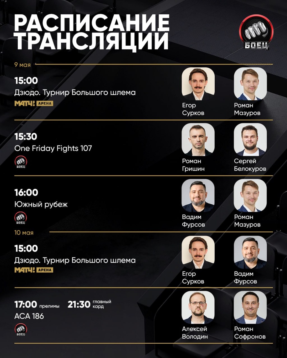 Какие трансляции ожидают нас в ближайшие дни? 📺 🥋Этап Большого шлема в Казахстане по дзюдо. Все три дня соревнований на каналах холдинга Матч! 👊Традиционный турнир ONE Friday Fights 107. Также не пропустим ивент лиги «Южный Рубеж» (в 16:00 трансляция стартует на сайте matchtv.ru без комментаторов. На Матч!Боец она начнется с 19:30 с комментаторами) ⚔️В субботу смотрим АСА 186. В главном событии состоится реванш Богатырева и Корнилова 🏆Закрепляем все UFC 315 с двумя титульными встречами. Мухаммад и Делла Маддалена побьются за пояс в полусреднем весе, а Шевченко сойдется с Фиро 🔥Параллельно этому состоится турнир Bare Knuckle FC 74 Заходите на сайт и выбирайте трансляцию для себя 😉
