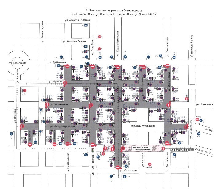 - с 20:00 8 мая до 15:00 9 мая – по ул. Молодогвардейской от ул. Венцека до ул. Ульяновской, по ул. Чапаевской от ул. Ленинградской до ул. Красноармейской, по ул. Фрунзе от ул. Некрасовской до ул. Вилоновской, по пер. Репина от ул. Галактионовской до ул. Молодогвардейской, по ул. Высоцкого от ул. Галактионовской до ул. Молодогвардейской, по ул. Некрасовской от ул. Галактионовской до ул. Куйбышева, по ул. Льва Толстого от ул. Галактионовской до ул. Куйбышева, по ул. Красноармейской от ул. Самарской до ул. Куйбышева, по ул. Шостаковича от ул. Фрунзе до ул. Куйбышева, по ул. Вилоновской от ул. Галактионовской до ул. Куйбышева;