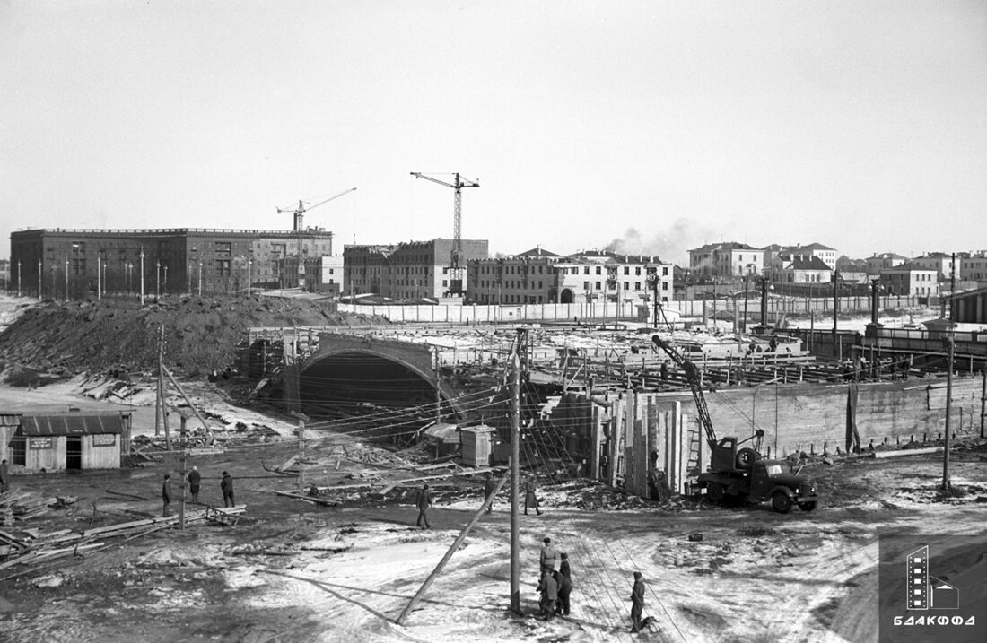 Отдельно стоит рассмотреть и тему жилищного строительства после войны. Ведь даже застройка главного проспекта - это в основном жилые дома. Вот, например, стройка дома напротив "Лакомки". Как видим, за будущим ГУМом еще пусто.