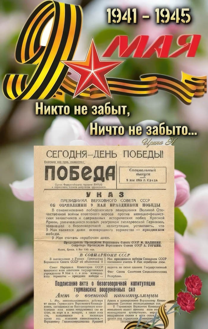 От всей души поздравляю всех с Великим праздником! Пусть каждая новая весна будет мирной и теплой, а горизонт не чернеет от копоти пожаров и не рвется от взрывов. Желаю вам простых радостей: ясного неба, детского смеха, цветущих садов, надежных друзей и крепких объятий! БЕССМЕРТНЫЙ ПОЛК Сияют звезды на Кремле, И лютый враг умолк. Вперед по выжженной земле Идет Бессмертный полк. И пусть, как пыль, летят года, Наступит наш черёд. Уходят лица, имена, Но полк идет, идет... Шеренги призрачных солдат, Героев и отцов, Где каждый, будь он стар иль млад, Гнал в шею подлецов. Сражался каждый до конца За Родину и честь. Любовь и боль у них в сердцах, В глазах – огонь и месть. Они один лишь день в году Бросают небеса, Чтоб видеть Родину свою И правнуков глаза. Вновь скалит зубы на людей Война – жестокий волк, И, чтобы помнили о ней, Идет Бессмертный полк. (Н. Виннер)