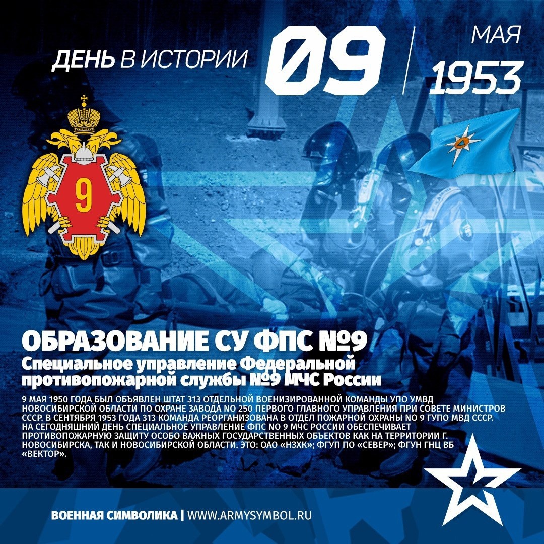 СУ ФПС №9 с 1953 специальное управление федеральной противопожарной службы 9 мая 1950 года был объявлен штат 313 отдельной военизированной команды УПО УМВД Новосибирской области по охране завода No 250 Первого Главного Управления при Совете Министров СССР. В сентября 1953 года 313 команда реорганизована в Отдел пожарной охраны No 9 ГУПО МВД СССР. На сегодняшний день Специальное управление ФПС No 9 МЧС России обеспечивает противопожарную защиту особо важных государственных объектов как на территории г. Новосибирска, так и Новосибирской области. Это: ОАО «НЗХК»; ФГУП ПО «Север»; ФГУН ГНЦ ВБ «Вектор».Открытое акционерное общество «Новосибирский завод химконцентратов» (сокращённое название — «НЗХК») – одно из предприятий российского ядерного топливного цикла. Основной вид деятельности – выпуск ядерного топлива для энергетических и исследовательских реакторов.Федеральное государственное у Показать полностью... Подпишитесь на наши группы ВКонтакте и в Одноклассниках - читайте, смотрите и