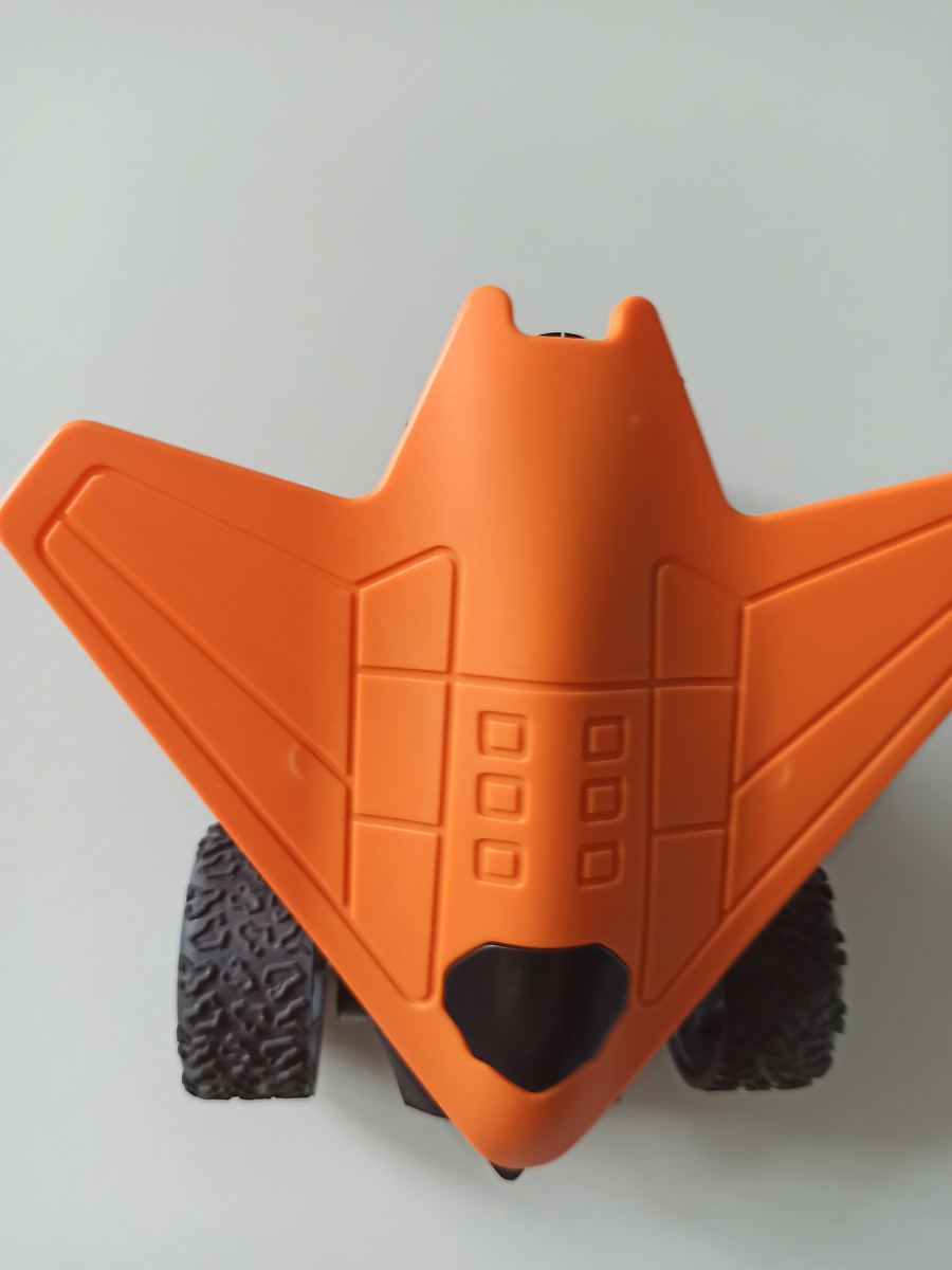 В тот день Fix Price встретил меня привычным шумом прилавков и яркими ценниками, зазывающими к приключениям. Среди гор игрушек, канцелярии и мелочей для дома мой взгляд уцепился за нечто необычное — миниатюрную машинку, которая словно сошла со страниц фантастического комикса. Всего 35 рублей — и эта жемчужина стала моей. Она была идеальна. Четыре колеса, будто созданные для двух разных эпох: задние — компактные, словно от гоночного карта, а передние — широкие, массивные, как у джипа-покорителя бездорожья. Но самое волшебное скрывалось в дизайне: верхняя часть корпуса, вылитая из гладкого пластика цвета оранжевой молнии, повторяла обтекаемую форму истребителя. Казалось, ещё мгновение — и игрушка взмоет в воздух, оставив на земле лишь след восторга. Я вертел её в руках, разглядывая детали. Задние колёса, крошечные, но упрямые, словно твердили: *«Мы — для скорости»*. Передние же, внушительные, с глубоким протектором, будто шептали: *«А мы — чтобы нестись сквозь любые преграды»*. А м