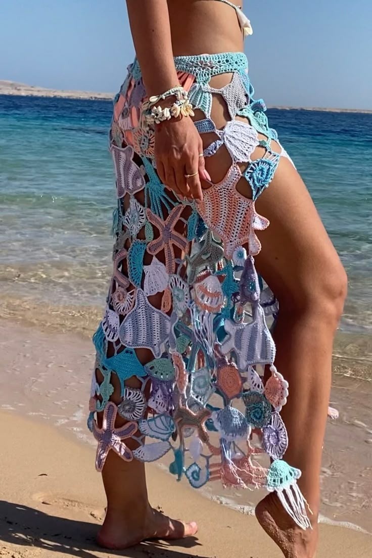 Многим понравилось парео, которое я недавно показывала: А я нашла ещё много похожих моделей пляжной одежды, и схем фрагментов, из которых можно связать такие модели. Итак, сначала сами модели: (у меня даже ракушки искусственные есть, теперь я знаю, куда их пристроить) Здесь ракушки чередуются с простым узором, а выглядит тоже замечательно : И схемы морских обитателей: Больше схем здесь: Из таких фрагментов можно связать и косыночку. А эта картинка навела меня на идею, что можно связать сетку, а на неё пришить готовые фрагменты: