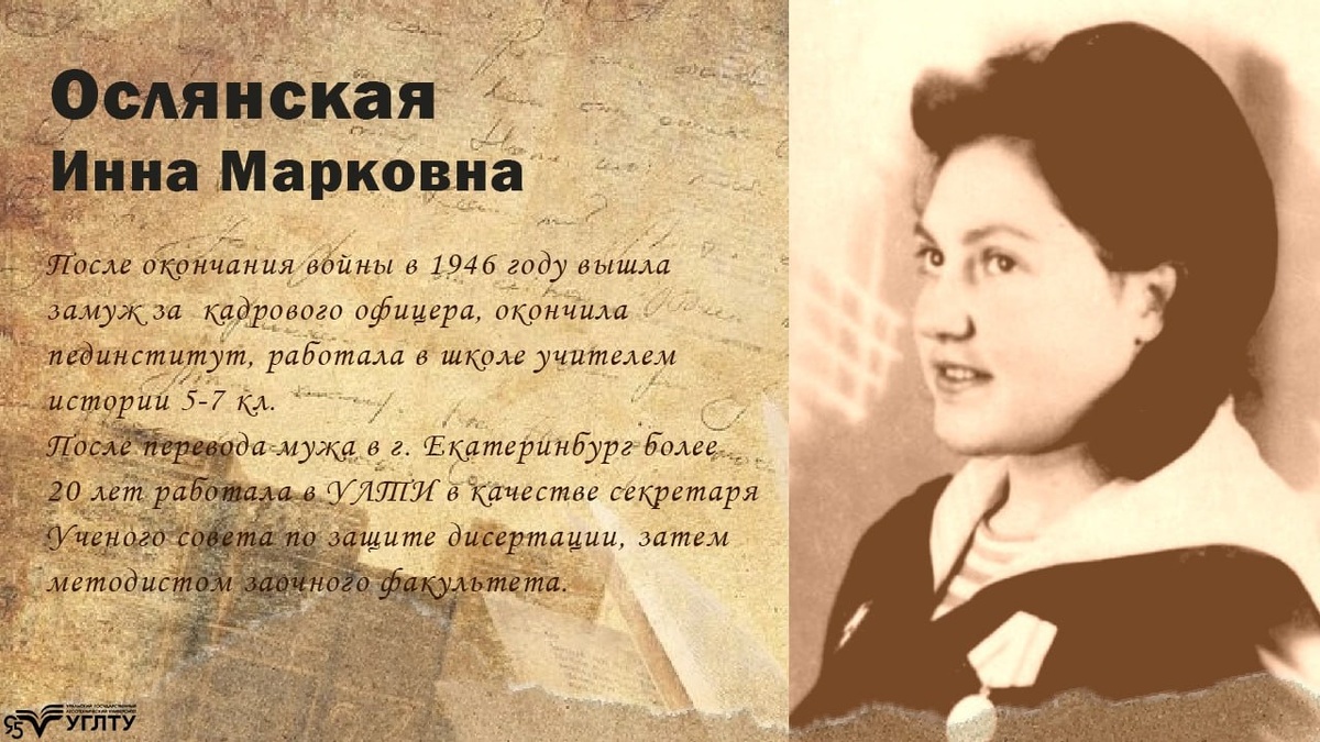 #герои_ВОВ_УГЛТУ 🔍 О героях, о той памяти, которая живет в сердцах наших современников рассказываем в наших социальных сетях usfeu.ru/universite... Ослянская Инна Марковна В 1941 году, в июне, окончила 10 классов. Получив аттестат об окончании школы, готовилась к выпускному балу. Но внезапное нападение Гитлеровской Германии изменили планы. С первых дней уже бомбили Киев. На второй день войны проводила мать на фронт. В числе других школьников рыла противотанковые рвы, окопы. С мая 1942г. по ноябрь 1945 года была медицинской сестрой хирургического отделения лазарета ВВС на берегу Баренцева моря, затем медпункта боевого авиационного полка дважды героя Советского Союза Сафонова. После перевода мужа в г. Екатеринбург работала более 20 лет в Уральском лесотехническом институте в качестве секретаря Ученого совета по защите диссертации, затем методистом заочного факультета. #НаучныйПолк #Победа80