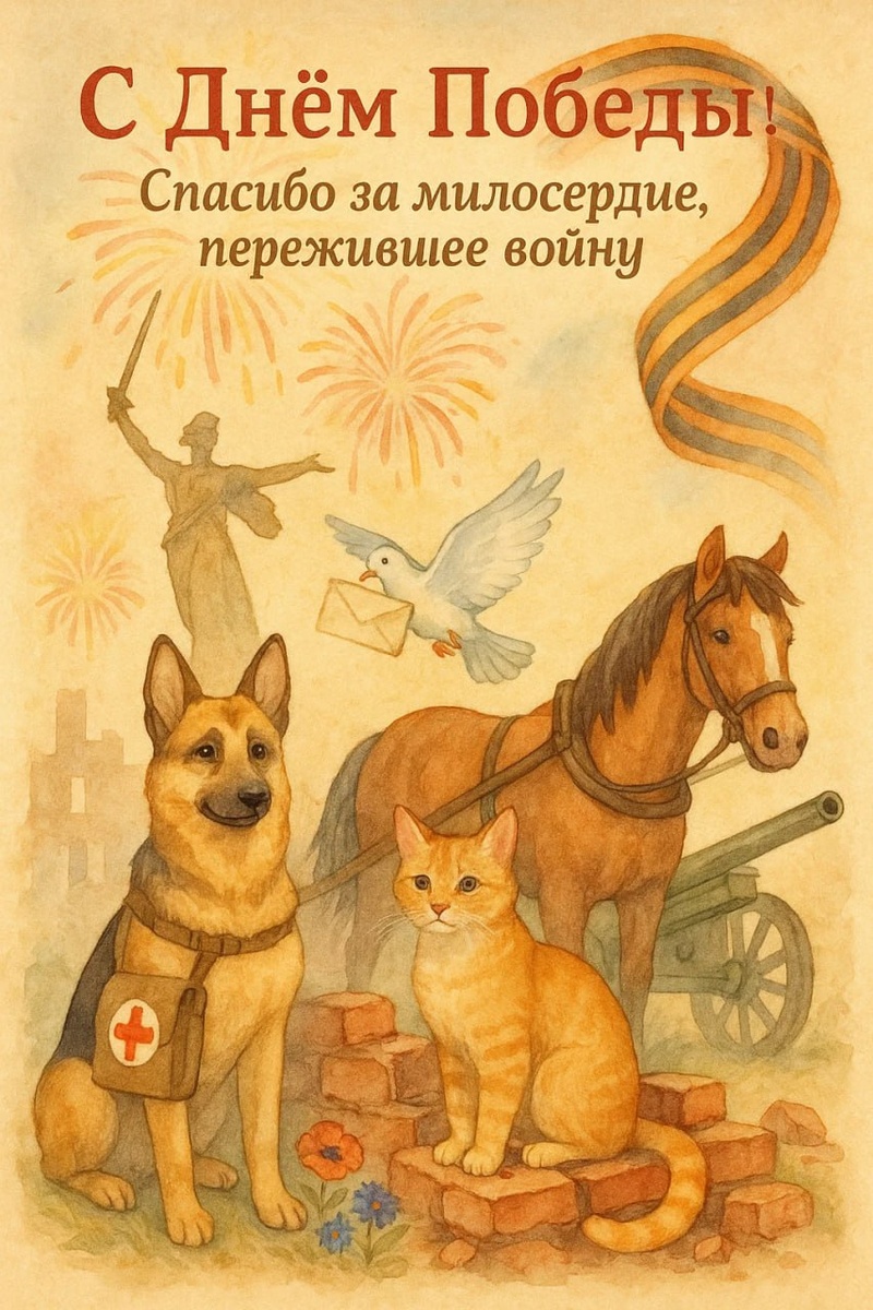 С Днём Победы! 🎖 Сегодня мы вспоминаем героев, подаривших нам мирное небо, и тех, кто сражался рядом с ними на передовой: • Собак-санитаров, выносивших раненых с поля боя • Кошек-защитников, спасавших блокадный Ленинград от крыс и эпидемий • Лошадей и голубей, без которых не обходились ни связь, ни перевозки В те страшные годы люди, сами голодая, делились последним с животными — потому что милосердие оставалось даже в войну. Спасибо вам за то, что продолжаете эту традицию сострадания. За каждый спасённый хвост, за каждую протянутую руку помощи. Пусть в ваших сердцах всегда живёт мужество тех, кто отстоял мир, и доброта тех, кто его сохраняет. #9мая #ЯПолезныйИнтересный #ВеликаяПобеда