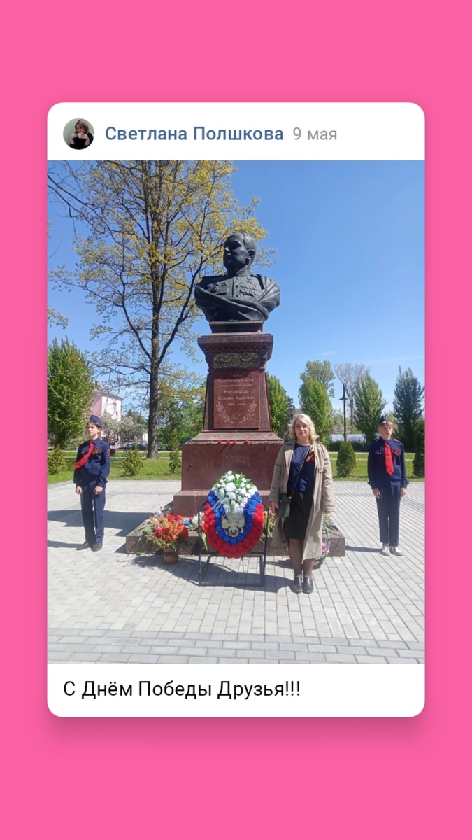 А ещё в этот день я смотрю по телевизору фильмы про Великую Отечественную войну, многие из них трогают больно мое сердце, смотрю , плачу и горжусь этими сильными! Мужественными людьми! Которые принесли нам Мир! Которые воевали на фронте и в тылу во имя нас! Не жалея своих жизней!