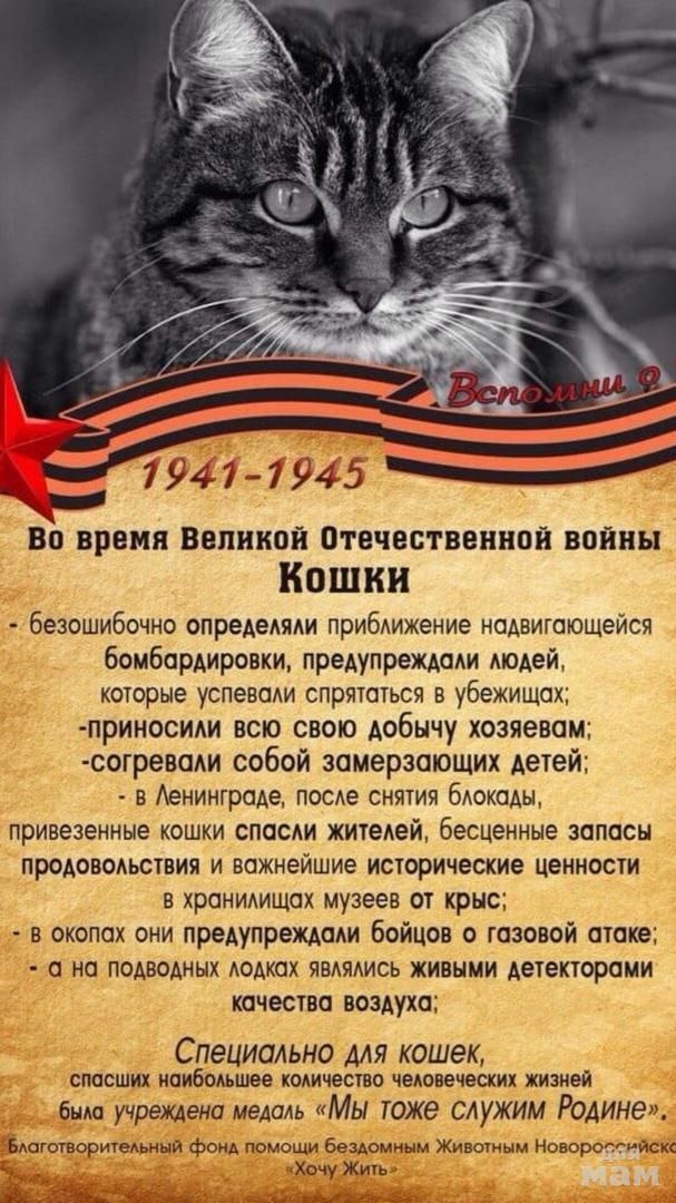 С днем Победы!🎇 Мало кто знает, что во время Великой Отечественной войны пушистые воины, также, как и люди, совершали подвиги, спасали человеческие жизни, выполняя роль «живых радаров», поддерживали моральный дух солдат. Благодаря своей интуиции и поразительной чувствительности кошки безошибочно определяли приближение надвигающейся бомбардировки. Кошек часто брали на подводные лодки, чтобы служить детекторами чистоты воздуха и предупреждать о газовой атаке. Известен такой случай. В 1941 году на одной из зенитных батарей, охранявшей небо Ленинграда, жил кот Васька. У него была одна особенность: еще до появления немецких самолетов и до того, как об этом сообщали звукоулавливатели, кот настораживался, поворачивал ухо в сторону приближающейся опасности и никак не мог успокоиться. Если вражеские самолеты летели прямо на батарею, кот мгновенно куда-то исчезал и появлялся только после отбоя воздушной тревоги. На наши самолеты кот не реагировал. Такое поведение Васьки быстро научились и
