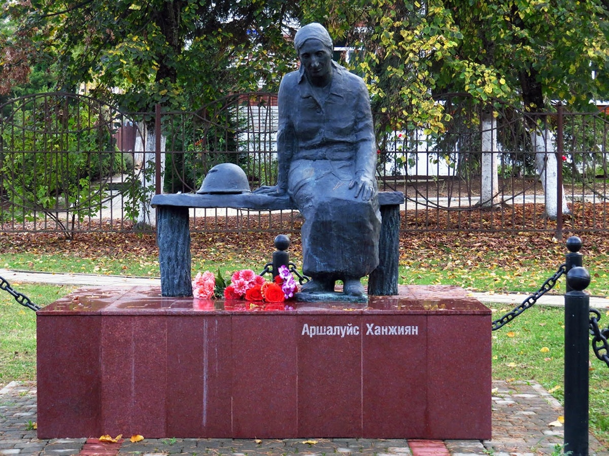Горячий Ключ (Краснодарский кр.), памятник Аршалуйс Хажинян Осенью 1942 года, когда в этих предгорьях кипели жесточайшие бои на переднем крае немецкого наступления, её дом в глухом хуторе со звучным названием Поднависла превратился в армейский медпункт. За первыми раненными солдатами 30-летняя, и видимо уже овдовевшая Аршалуйс ухаживала одна, но вскоре ей на помощь в Поднависле развернулся целый полевой госпиталь. Врачом Аршалуйс Кеворковна не была, и в наше время её назвали бы скорее волонтёром, однако помимо чисто практической заботы она оказывала раненным и моральную поддержку, для очнувшегося безногим молодого парня находя такие слова, от которых он был готов за свою жизнь побороться. Поговаривают, одного из раненных Аршалуйс успела полюбить, но спасти его не сумела, и промучившись несколько недель, солдат скрылся в разросшейся братской могиле. Немцев вскоре выбили из Горячего Ключа, фронт стремительно ушёл на запад, а с ним уехал и полевой госпиталь. Дом Ханжиян остался чуть