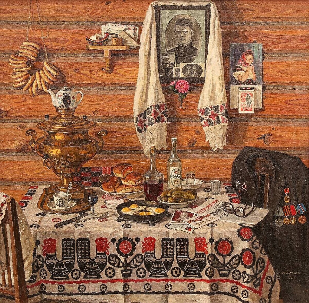 С Днем Великой Победы! 🖼️ Ю.И. Семенюк. Сегодня в России праздник (1975) Юрий Иванович Семенюк – участник Великой Отечественной войны (1941–1946). Награжден орденами Отечественной войны II степени и Красной Звезды, медалями «За отвагу» и «За победу над Германией», памятными медалями и знаками. Художник-солдат Ю.И. Семенюк прошел боевой путь от Сталинграда до Праги, командовал взводом, батареей и дивизионом истребительной противотанковой артиллерии. Первая картина, показанная им на выставке армейских художников в 1946 году, «Форсирование Днепра», была связана с самым тяжелым эпизодом его армейской жизни. Натюрморт «Сегодня в России праздник» написан в 1975 году к 30-летию Победы. Без нарочитого пафоса, через подробное перечисление простых, привычных бытовых предметов художник рассказывает о жизни фронтовика, истории страны. #ЯХМ #Победа80