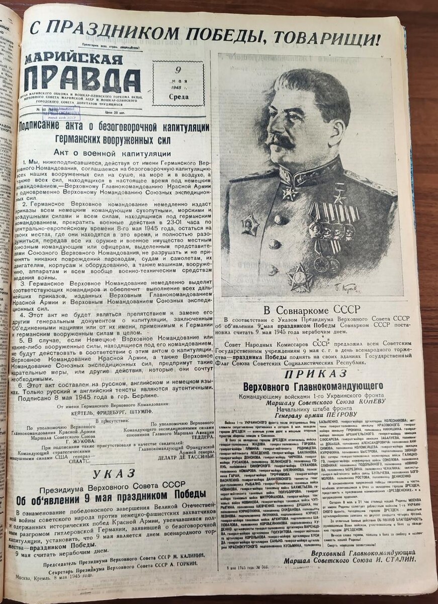 Вот так марийская пресса встретила Победу в мае 1945 года. Тот самый 90-й выпуск газеты «Марийская правда» от 09.05.1945 года. На первой полосе главная новость: подписание акта о безоговорочной капитуляции германских вооруженных сил, портрет Иосифа Сталина, а также Указ Президиума Верховного Совета СССР об объявлении 9 мая праздником Победы, постановление Совнаркома СССР об объявлении Дня Победы нерабочим днем и Приказ Верховного Главнокомандующего Командующему войсками 1-го Украинского фронта Маршалу Советского Союза Коневу, начальнику штаба фронта генералу армии Петрову. 📸 Фото: издательский дом «МариКраевед»