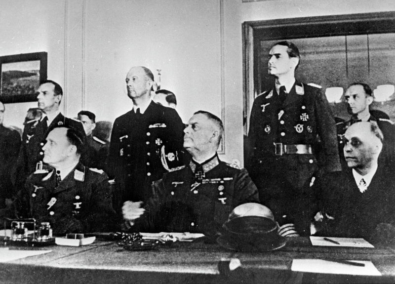 Следующим шагом, поставившим окончательную точку в разгроме нацистской Германии, стало подписание в ночь с 8 на 9 мая 1945 года Акта о безоговорочной капитуляции в предместье Берлина Карлсхорсте. В ходе данной процедуры советское Верховное Главнокомандование представлял Маршал Советского Союза Г. К. Жуков, вооруженные силы Соединенных Штатов Америки — генерал К. Спаатс, верховное командование Великобритании — маршал авиации А. Теддер, французские вооруженные силы — генерал Ж.-М. де Латр де Тассиньи. В свою очередь германские вооруженные силы представляли фельдмаршал В. Кейтель, адмирал Г. Фридебург и генерал-полковник Г. Штумпф, получившие от К. Дёница необходимые полномочия.