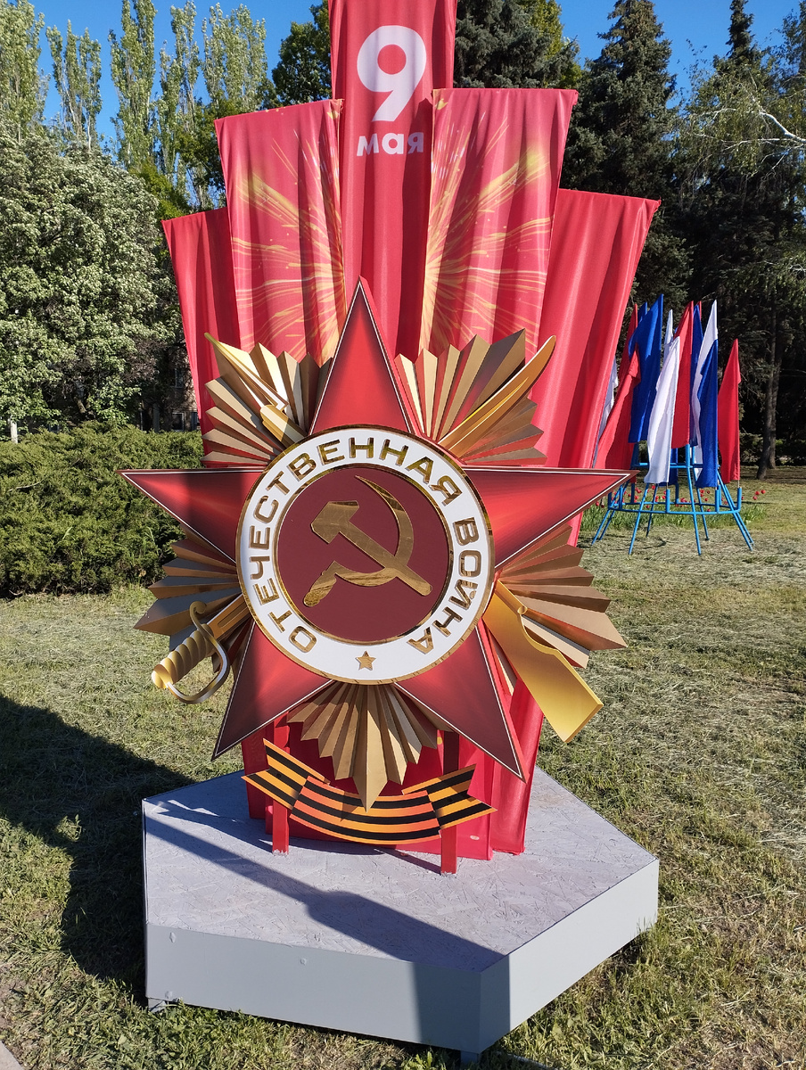 Естественно, готовились заранее. Повсюду в городе появились праздничные инсталляции и прочая атрибутика. Разумеется, её гораздо меньше, чем три года назад, но всё-таки Донецк встречает 9 мая, как подобает. Вот такая инсталляция, как на заглавном фото, установлена возле районных администраций. А у входа в магазины и кафе обязательно наклеены яркие праздничные листочки. Конечно, лучше всего украшена площадь Ленина. Здесь самая главная инсталляция Донецка. Довольно скромная, но необычная. Всего шесть объёмных букв. Установленные на постаменте с узнаваемой георгиевской лентой, они складывают самое важное слово сегодняшнего особенного дня. Конечно, новый объект на площади Ленина сразу привлекает внимание горожан. В особенности, самых младших. Они обязательно здесь хотят сфотографироваться. А на белых буквах инсталляции реальные фотографии Победителей. Площадь Ленина в Донецке украшена красными знаменами. Плакатами ко Дню Победы украшен фасад драматического театра. На бульваре Пушкина у каф