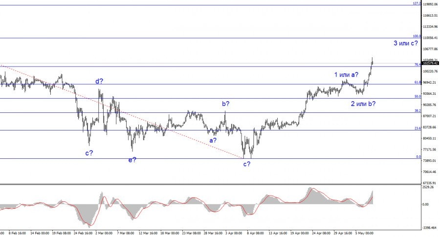 Волновая разметка 4-часового графика для инструмента BTC/USD усложняется в последние месяцы. Мы увидели коррекционную нисходящую структуру, которая завершила свое построение около отметки 75000$. После этого началось довольно сильное повышение, которое может быть началом нового импульсного тренда. Первая волна этого участка тренда выглядит завершенной, но при этом вторая волна приняла малый и неубедительный вид.
