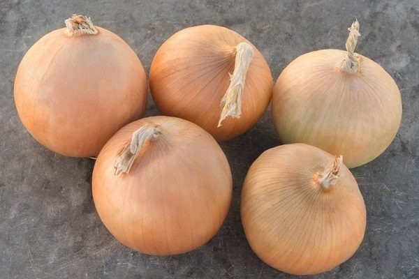Луковица округлая, слегка вытянутая, весит около 70-80 г и достигает до 8 см в диаметре. Шелуха окрашена в золотистый или светло-коричневый оттенок, а внутри состоит из белых, сочных чешуек. У овоща тонкая и короткая шейка.