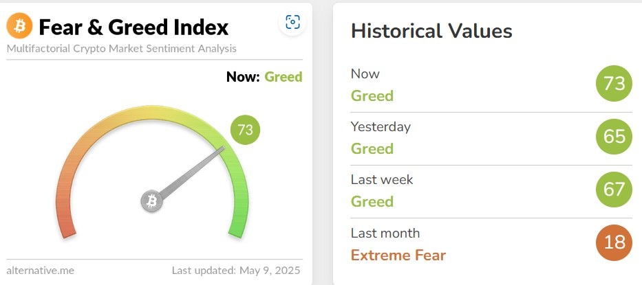 «Индекс страха и жадности» криптовалюты составляет 73... Жадность продолжается