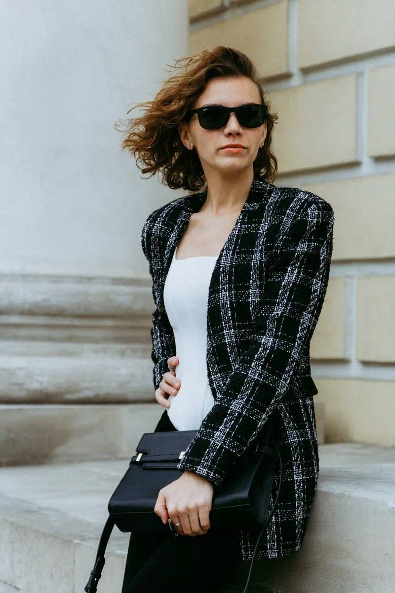 Ну а для прохладной и ветренной погоды как сейчас незаменим блейзер из букле, на Юле он в сочетании с летящими палаццо из крепа + уже знакомый вам молочный корсет