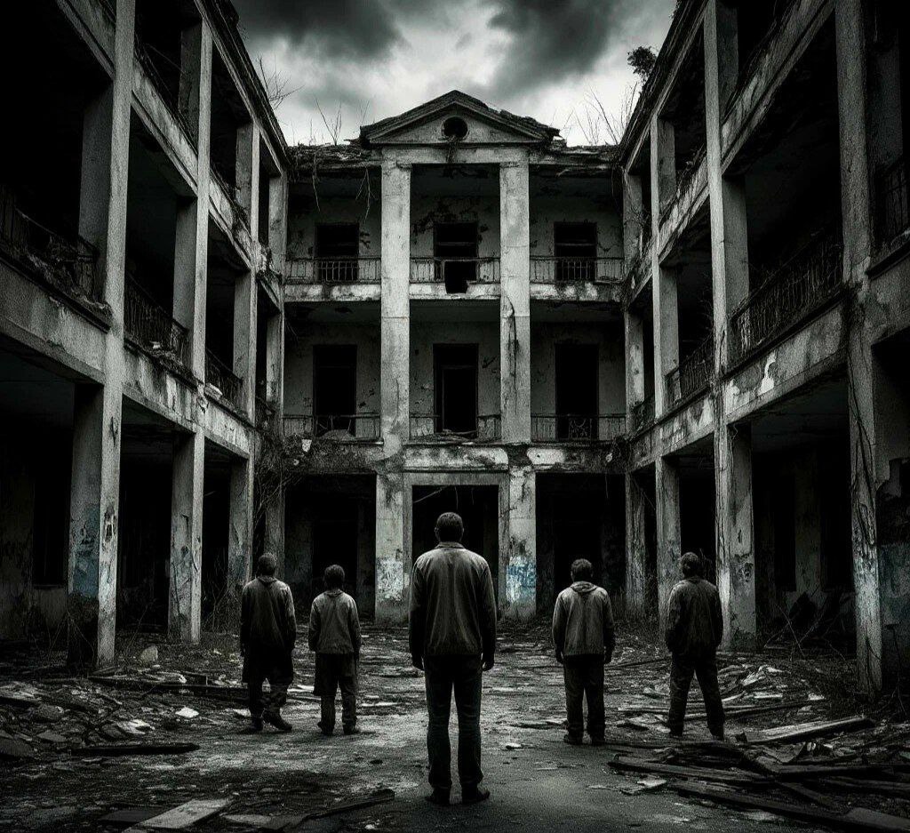 Это случилось весной, когда мы с друзьями — Максом, Ирой, Димой, Лерой и мной — решили исследовать заброшенную больницу на окраине города. Здание давно обросло легендами: говорили, что здесь обитает нечто потустороннее, и многие, кто заходил внутрь, сталкивались с необъяснимыми явлениями. Мы вошли через разбитое окно на первом этаже. Внутри царила тишина, нарушаемая лишь скрипом наших шагов и отголосками прошлого: облупившиеся стены, ржавые койки, разбросанные медицинские инструменты. Мы разделились: Макс с Ирой пошли на второй этаж, Дима с Лерой — в подвал, а я остался исследовать первый этаж. Спустя полчаса я услышал крики. Сердце забилось быстрее. Я побежал на звук и встретил Диму, который выбежал из подвала, бледный как полотно. — Лера... она исчезла. Мы с Димой обыскали подвал, но Леры нигде не было. На стене мы нашли надпись: «Один за всех». Это было написано свежей краской, хотя никто из нас не брал с собой ничего подобного. Поднявшись на второй этаж, мы обнаружили Макса, сидящ