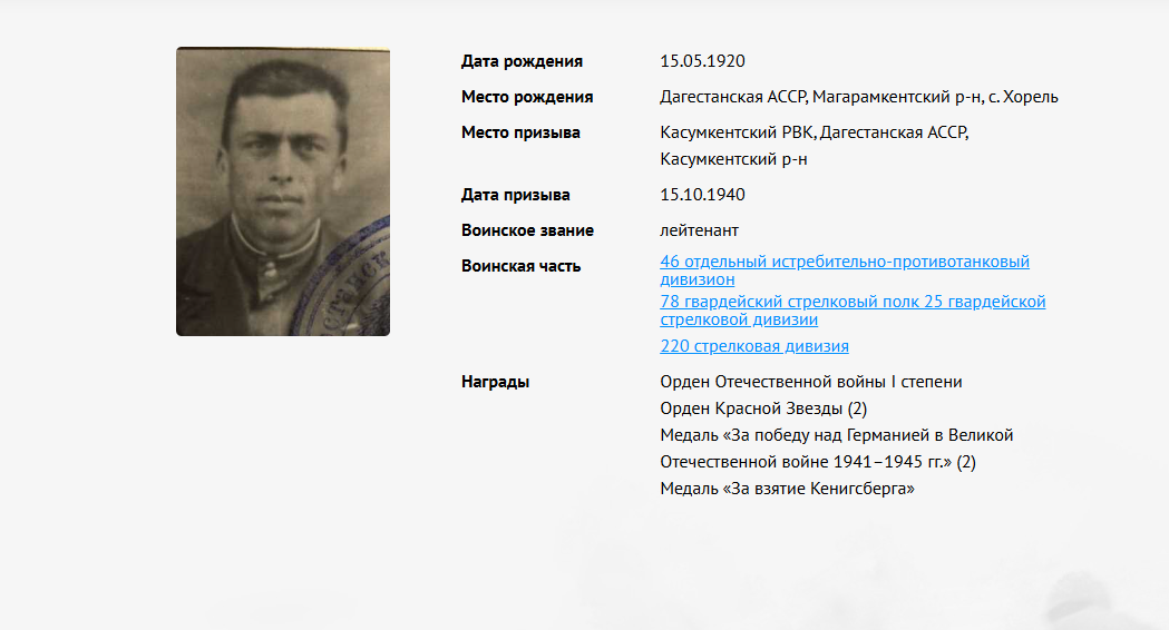 Абдуллаев Эрзихан, 15.05.1920 г.р., младший брат моего дела, Абдуллаева Кизимхана. 15.10.1940 был призван в ряды Красной Армии. Службу проходил в 46 отдельном истребительно-противотанковом дивизионе; 78 гвардейском стрелковом полку 25 гвардейской стрелковой дивизии; 220 стрелковой дивизии. Лентенант Абдуллаев в наступательных боях в Восточной Пруссии проявил мужество, решительность и уменье. 31 Января 1945 г под Катценом во время боя с противником личным почином выбросил орудие на прямую наводку и расстрелял в упор двигающуюся колонну немце в по дороге и уничтожил два пулемета, сильно мешавших успешному продвижению вперед нашей пехоте. ...» Награжден орденом Отечественной Войны | степени, орденом Красной звезды, медалью «За взятие Кениксберга», медалью «За победу над Германией в Великой Отечественной Войне». Службу завершил 25.05.1946.