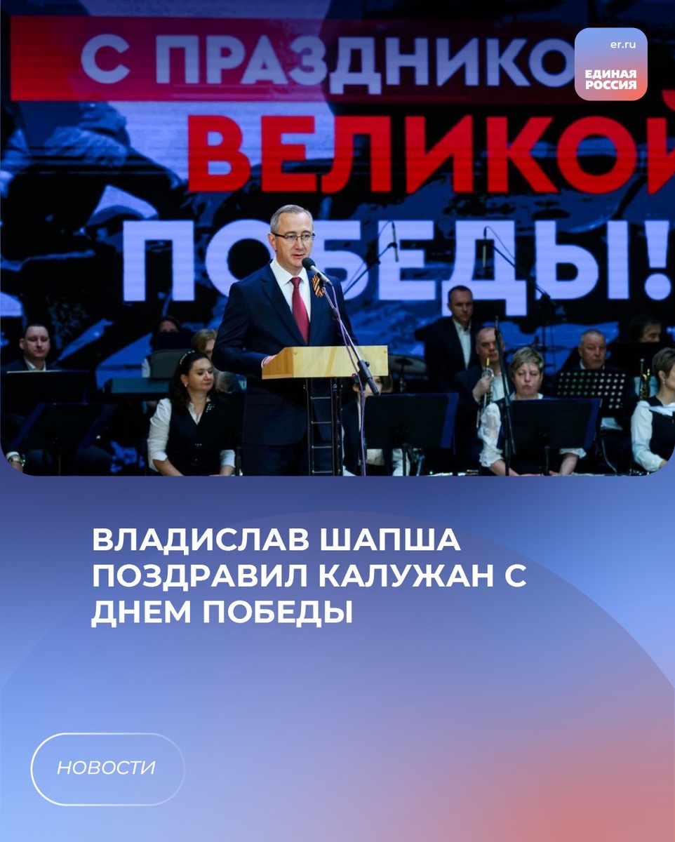 "ДОРОГИЕ ЗЕМЛЯКИ! 80 лет назад верх над фашизмом одержала сила правды, мужества, сплоченности нашего многонационального народа. В юбилейный Год Победы в Великой Отечественной войне мы вновь вспоминаем о подвигах наших отцов и дедов. Судьба человечества решалась в кровопролитных битвах ценой многомиллионных жертв наших соотечественников. Путь к Победе длился долгих 1418 дней и ночей. Это было время самоотверженности и массового героизма. Эхо далекой войны и сегодня живет в наших сердцах, передается следующим поколениям, сохраняя правду о великих испытаниях и победах наших предков – тех, кто шел навстречу смерти в боях во имя спасения Родины, тех, кто своим трудом в тылу приближал Победу. Дорогие ветераны, здоровья вам и долгих лет жизни, мира и благополучия всем жителям региона. С великим праздником! С Днем Победы!", - Секретарь регионального отделения партии «Единая Россия», губернатор Калужской области Владислав Шапша #ЕР40 #ЕдинаяРоссия #НашаПобеда80