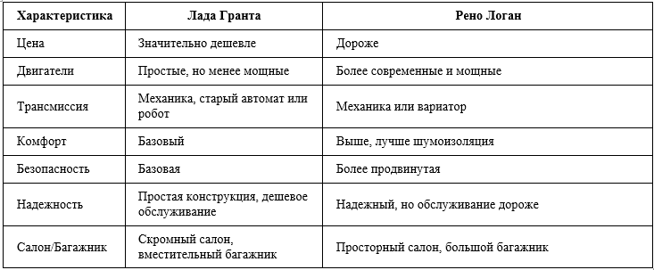 Сравнение Лады Гранты и Рено Логан – классический пример выбора между бюджетным российским и бюджетным иностранным автомобилем. Оба автомобиля предназначены для практичного покупателя, ценящего надежность, простоту и доступность. Давайте рассмотрим основные характеристики и сравним их: 1. Цена: 2. Двигатели: 3. Трансмиссия: 4. Комфорт и оснащение: 5. Подвеска и управляемость: 6. Безопасность: 7. Надежность и обслуживание: 8. Салон и багажник: Подведем итог: Кому что подойдет: Рекомендации: В конечном счете, выбор зависит от ваших личных потребностей, бюджета и приоритетов. Удачи в выборе!