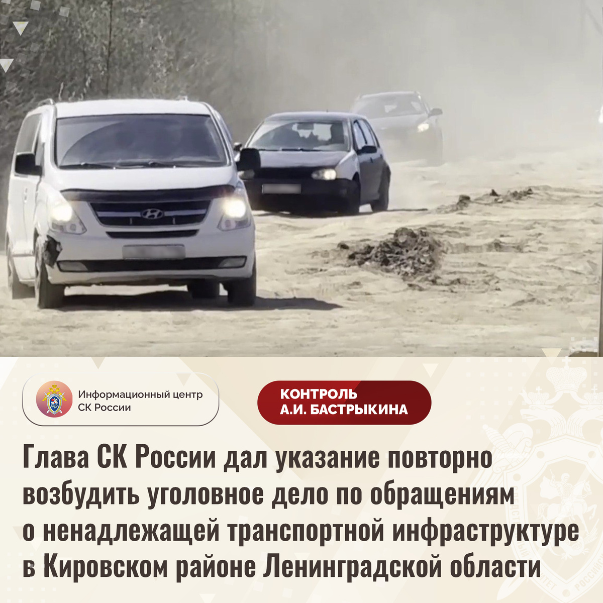 Глава СК России дал указание повторно возбудить уголовное дело по обращениям о ненадлежащей транспортной инфраструктуре в Кировском районе Ленинградской области В комментариях в аккаунте приемной Председателя СК России А.И. Бастрыкина «ВКонтакте» размещены обращения по вопросу непринятия мер к организации транспортной инфраструктуры в Кировском районе Ленинградской области. В 2019 году единственная подъездная дорога, ведущая к деревне Славянке и нескольким СНТ, была сдана в аренду корпорации «Р-Индустрия». Тяжелая техника организации, перемещаясь по неасфальтированному участку, привела дорогу в непригодное состояние. Так, на протяжении нескольких лет на ее поверхности имеются многочисленные ямы и колеи, грунтовое полотно при выпадении осадков и таянии снега размывается, а передвижение в сухую погоду приводит к появлению в воздухе большого количества песчаной пыли. В результате проезд транспортных средств к домовладениям и объекту культурного наследия федерального значения «Оборонитель